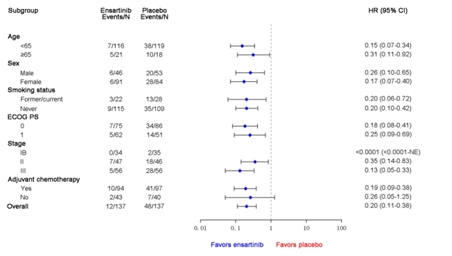 截止到2025年6月26日,在II-IIIB期患者中,兩組中位隨訪時間均為24.0個月。DFS HR為0.20(95% CI: 0.11-0.38;p<0.0001);恩沙替尼組2年DFS率為86.4%,安慰劑組為53.5%。在ITT人群中,DFS HR為0.20(95% CI: 0.10-0.37; p<0.0001);恩沙替尼組2年DFS率為87.3%,而安慰劑組為57.2%。各亞組中,傾向于恩沙替尼的DFS獲益一致。在ITT人群中觀察到具有臨床意義的CNS-DFS益處(HR 0.22;95% CI: 0.08-0.60)。OS不成熟(1%成熟度)。安全性與恩沙替尼的已知安全性一致。